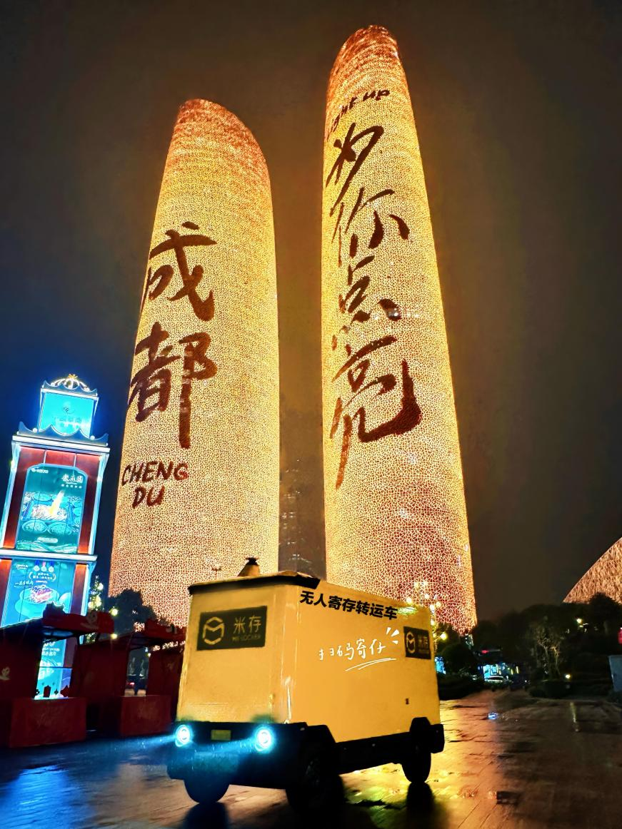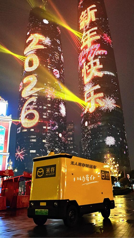 本次跨年活动围绕“城市发展与市民幸福生活”展开,通过天府双塔52000㎡巨幕灯光秀、市民心愿上塔、零点数字烟花等精彩环节,打造“1+6+N”超级场景,吸引12万余市民参与。面对市民庞大的随身物品寄存需求,米存科技与灵形开悟创新采用“智能寄存柜+无人移动寄存车”双轨服务模式,在主会场入口、交子之环周边及市集核心区进行了部署,市民可通过扫码开门、微信支付实现30秒内存取件,享受24小时无人值守的高效服务;针对亲子家庭及携带大件行李的游客,灵形开悟基于其在机器人租赁、场景解决方案和二次开发方面的技术优势,为无人移动寄存车提供全流程技术支持,灵活应对人流密集、路况复杂的现场环境,真正实现将寄存服务主动送到市民身边。