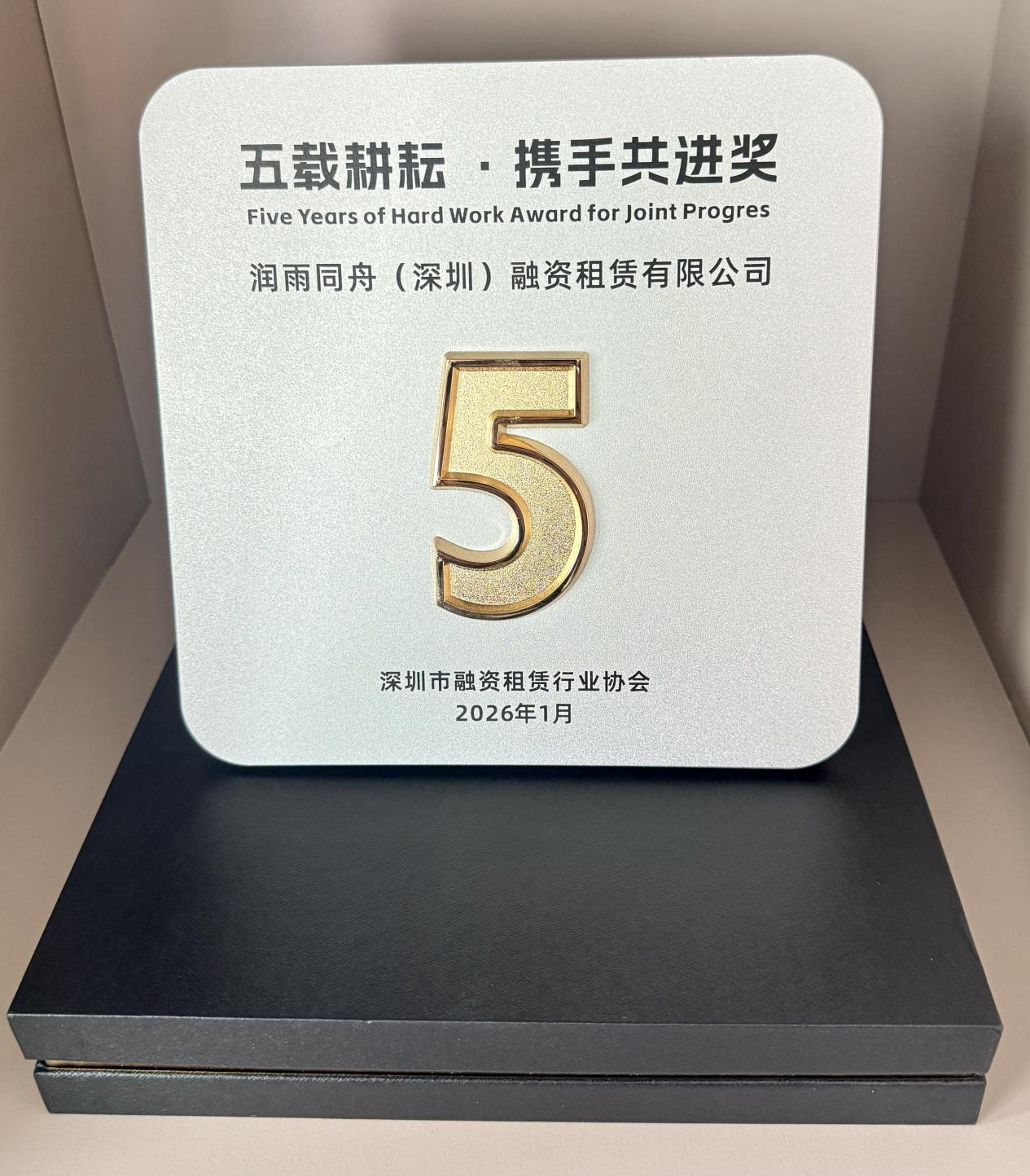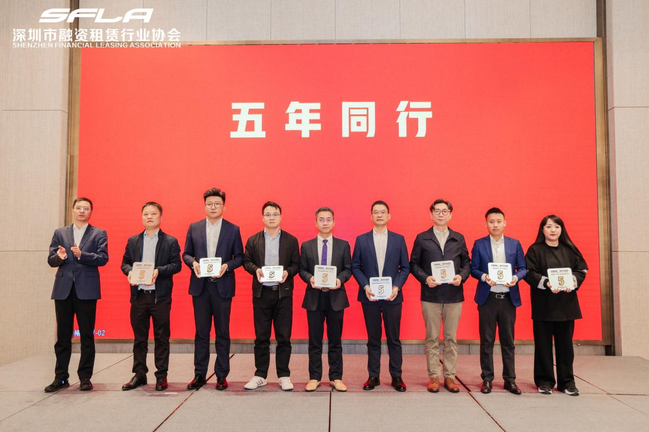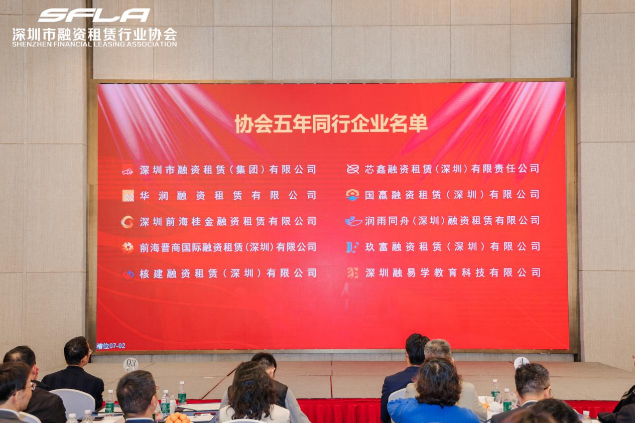 2025 年 1 月 14 日,深圳市融资租赁行业协会第三届第二次会员大会暨成立十周年答谢活动在深圳盛大启幕。本次活动汇聚了全市融资租赁企业及相关支持类机构代表 150 余人,共话行业发展蓝图。润雨同舟(深圳)融资租赁有限公司(以下简称 “润雨同舟”)受邀全程参与,凭借五年来与协会的同心同行、深耕实干,荣获 “五年耕耘携手共进奖”,成为行业认可的标杆企业之一。